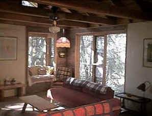 It shelters a hand-made stone hearth and fireplace opposite a cozy window seat