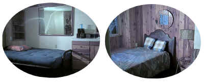 master bedroom still has it's original redwood paneling in place, but now sports a queen sized